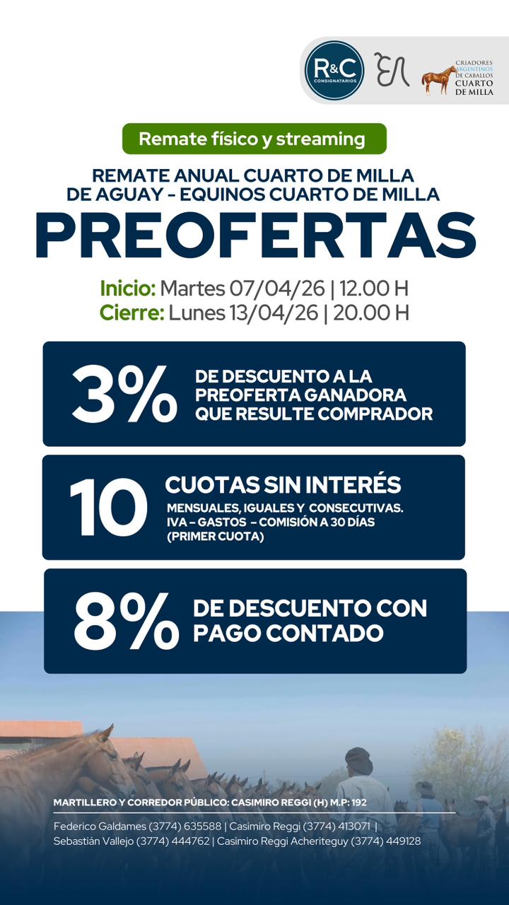 - + 3 % De descuento si resultará comprador en el animal en el cual hizo pre oferta.